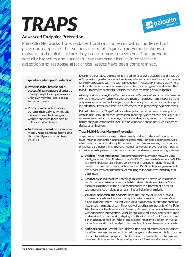 Traps Palo Alto Networks Receives a Recommendation Rating by NSS Labs for Advanced Endpoint Protection. Lightboard Series: Traps Advanced Endpoint Protection. Traps replaces legacy antivirus and secures endpoints with a multi-method prevention approach that blocks malware and exploits... Palo Alto Networks TRAPS | PaloGuard.com Palo Alto Networks TRAPS Coordinated, comprehensive endpoint protection and response. Palo Alto Networks Traps™ endpoint protection and response stops threats on endpoints and coordinates enforcement with network and cloud security to prevent successful cyberattacks. Palo Alto Networks Raises the Bar for Endpoint Security With Updates... The Palo Alto Networks Traps offering takes an innovative approach to endpoint security, keeping endpoints more secure despite a growing landscape of cyberthreats and reducing the resources required by IT teams to track and install security patches."