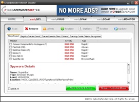 CyberDefenderFree 2.0 Freeware Download - Qweas.com A complete Internet security suite, CyberDefender FREE easy-to-use features include earlySPY a free spyware removal tool that removes known and unknown spyware and adware that can hijack your PC and steal personal information. earlyVIRUS is a comprehensive real-time free antivirus software tool that inoculates against viruses in about an hour ...
